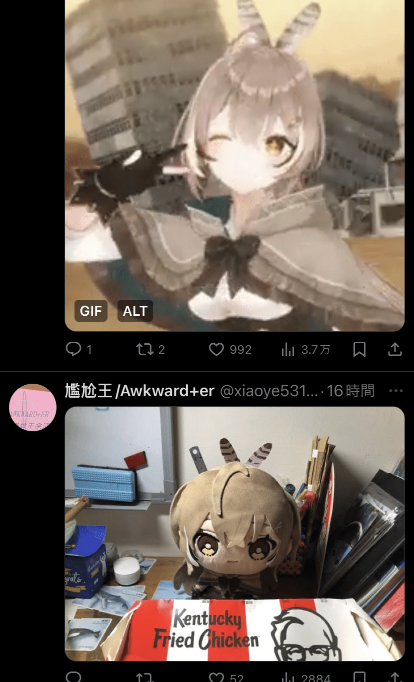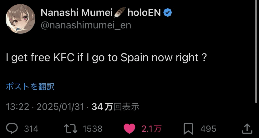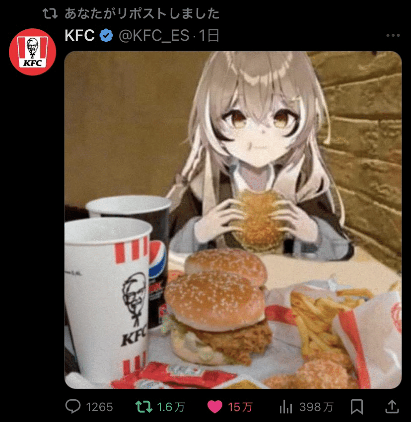 A few days ago, the official KFC Spain account suddenly posted a photoshopped image of Mumei (the emo girl from hololive EN)