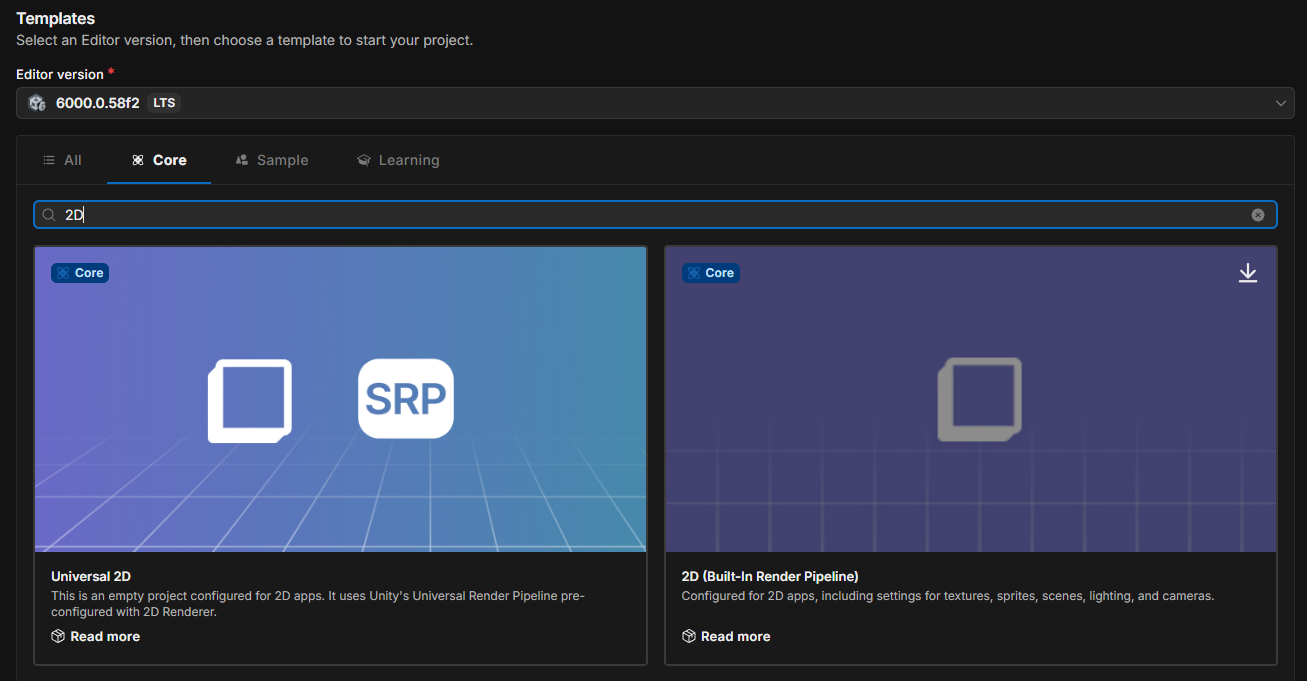 A common sticking point is whether to choose Universal 2D (URP) or 2D (Built-in Render Pipeline).
