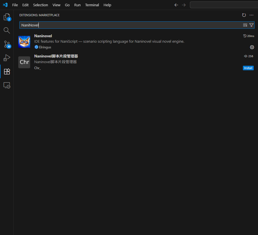 Then launch VS Code, click the Extensions icon on the left sidebar, search “Naninovel”, and install the extension.