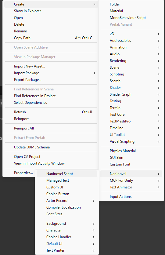 In the Unity Project window, create a “Naninovel Script.” The name can be anything.