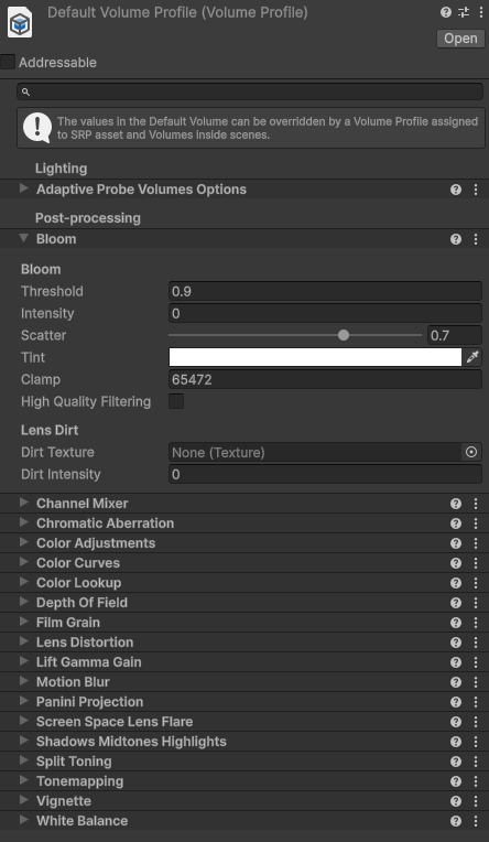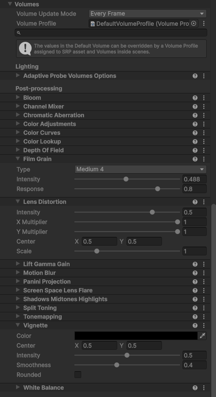 In this article we implemented FilmLook, but there are many other effects available in DefaultVolumeProfile.