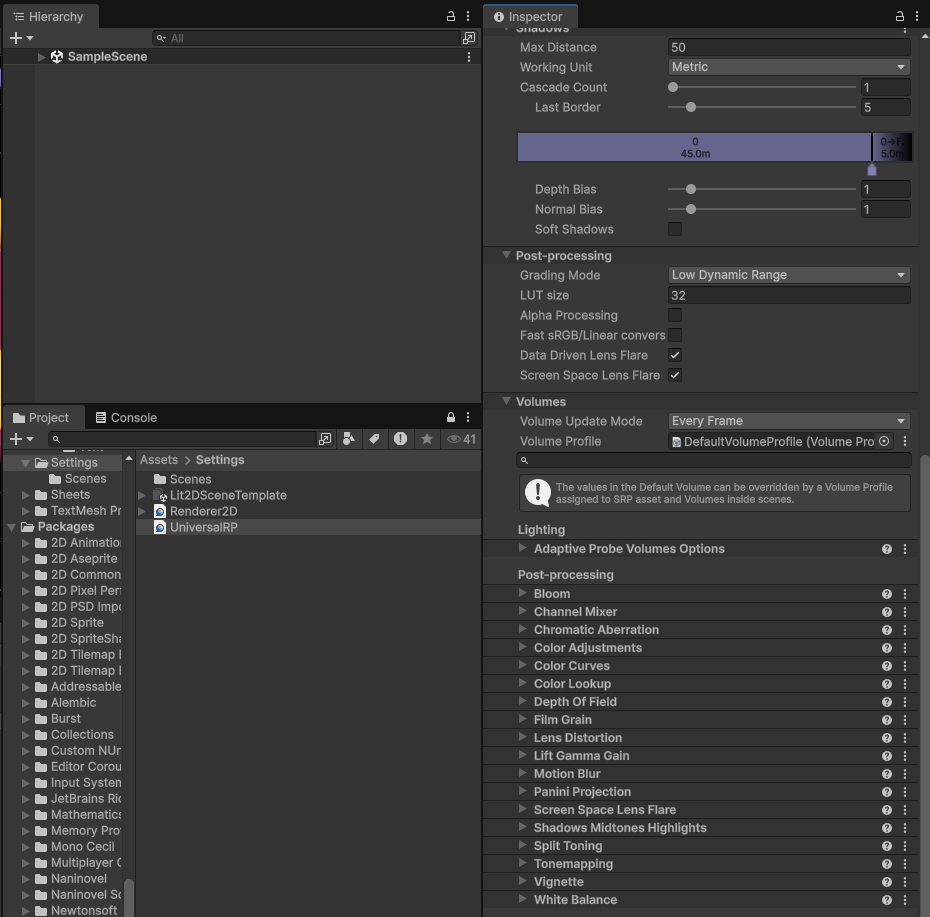 - The DefaultVolumeProfile is assigned to the Universal Render Pipeline’s Volume.
