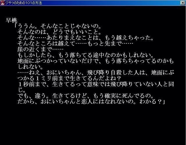 No… that’s not it. That kind of thing doesn’t matter. That… something so obvious, I’ve already gone past it. I’ve gone past that… and further ahead, right up to the edge of the cliff… Maybe I’m already in the middle of falling. Maybe I’ve already fallen —I just haven’t hit the ground yet. …Hey, onii-chan. Someone who’s jumped off… they’re alive right up until one millimeter before they hit the ground, right? Up until one second before —if you mean “alive,” they’re the same as an ordinary person. But it’s different. They’re alive, but they’re already certainly dead. So I can’t become your lover, onii-chan. You understand, right?