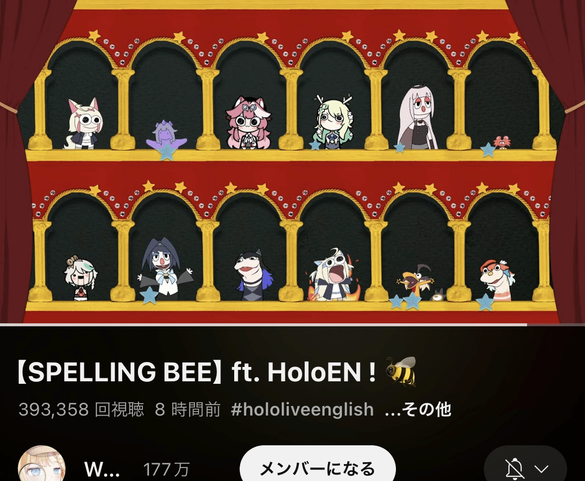 This morning’s SPELLING BEE, hosted by amesame (Amelia & Gura), was genuinely shocking. One by one, the participants’ standing avatars got increasingly deformed, and by the time everyone was assembled, it was basically a finished children’s TV show.