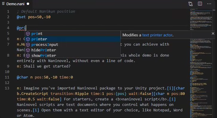 You call Naninovel-specific features with @ commands. The plugin suggests candidates—an amazing feature.
